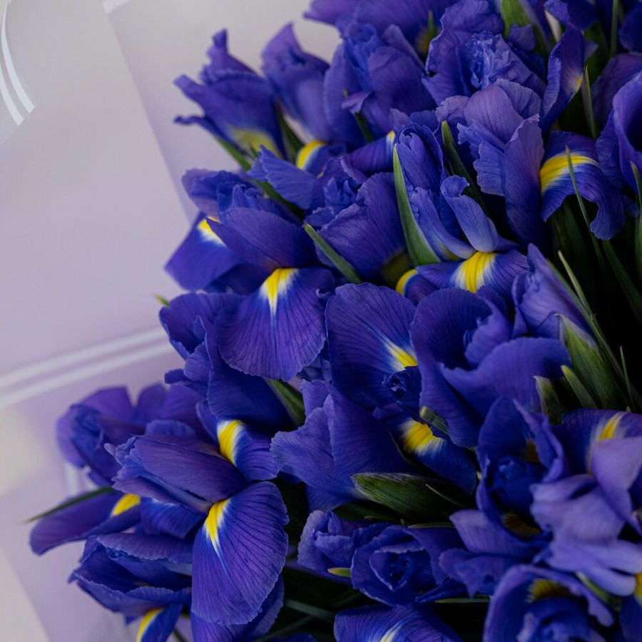 На фото букет из 101 синего ириса. В составе: ирис 101 шт, дизайнерская упаковка 1 шт, атласная лента 1 шт, . Все цветы свежие и ароматные, букет красиво оформлен и отлично подходит для подарка. Доступна доставка цветов или самовывоз.