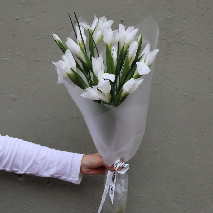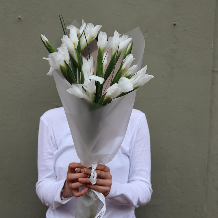 Букет 15 белых ирисов в стильной упаковке фото 4