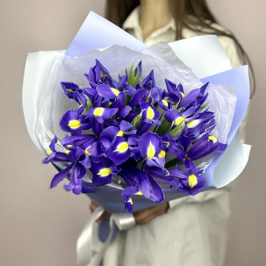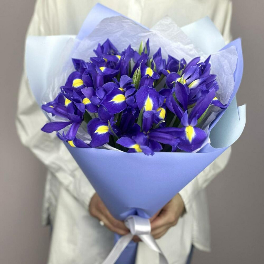 На фото букет из 15 синих ирисов. В составе: ирис 15 шт, дизайнерская упаковка 1 шт, атласная лента 1 шт, . Все цветы свежие и ароматные, букет красиво оформлен и отлично подходит для подарка. Доступна доставка цветов или самовывоз.