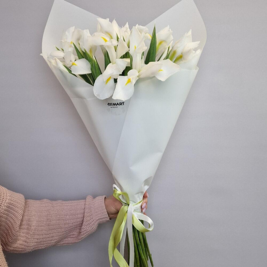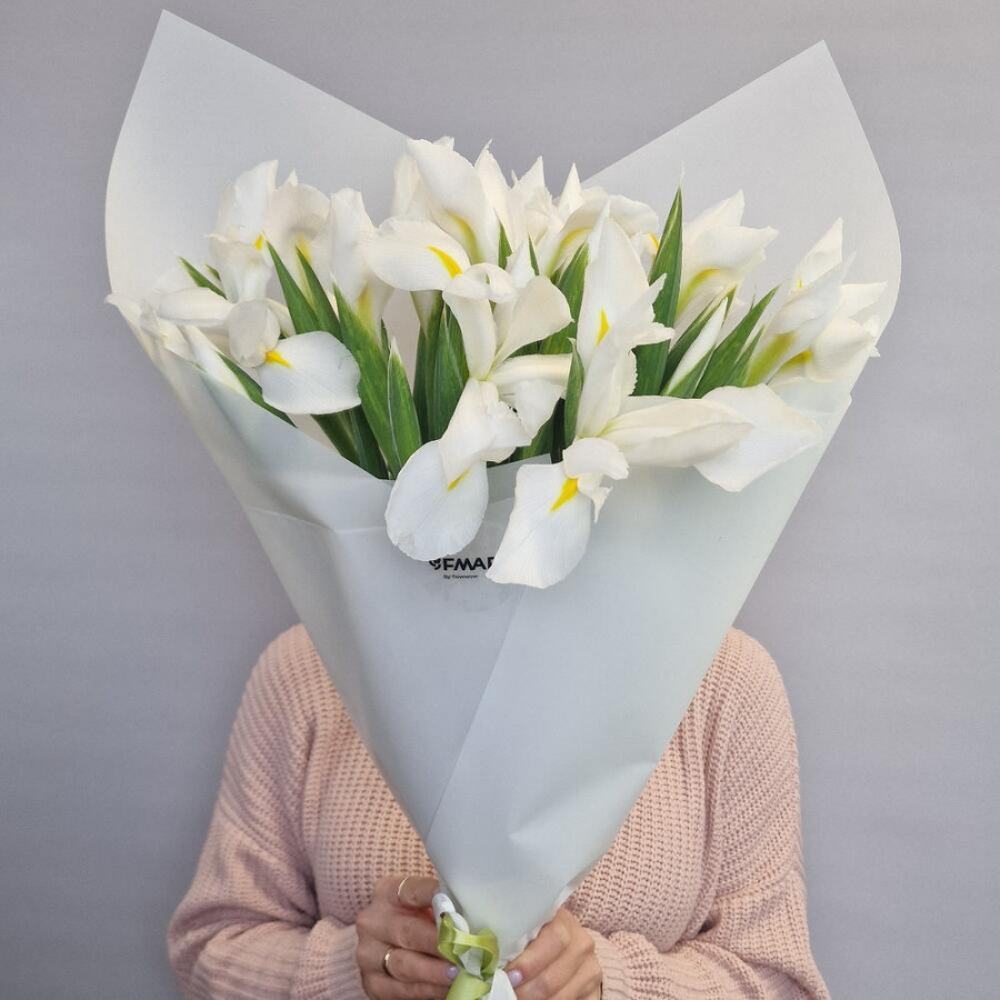 На фото букет 19 белых ирисов. В составе: ирис 19 шт, дизайнерская упаковка 1 шт, атласная лента 1 шт, . Все цветы свежие и ароматные, букет красиво оформлен и отлично подходит для подарка. Доступна доставка цветов или самовывоз.