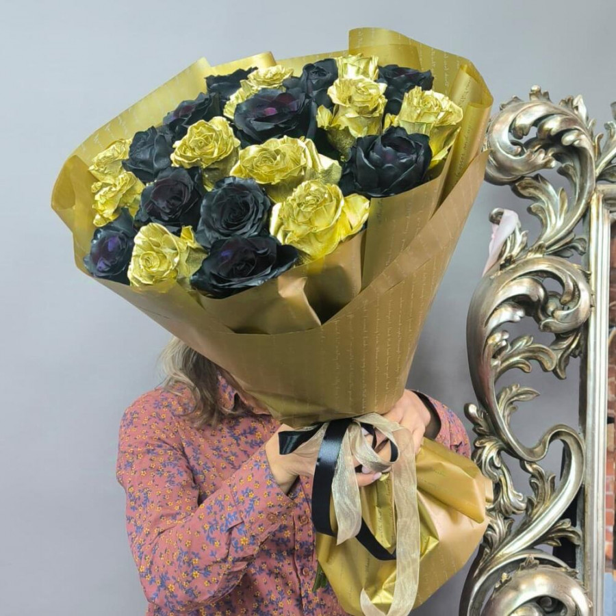 На фото букет из 25 черных и золотых роз. В составе: роза 25 шт, дизайнерская упаковка 2 шт, атласная лента 1 шт, . Все цветы свежие и ароматные, букет красиво оформлен и отлично подходит для подарка. Доступна доставка цветов или самовывоз.