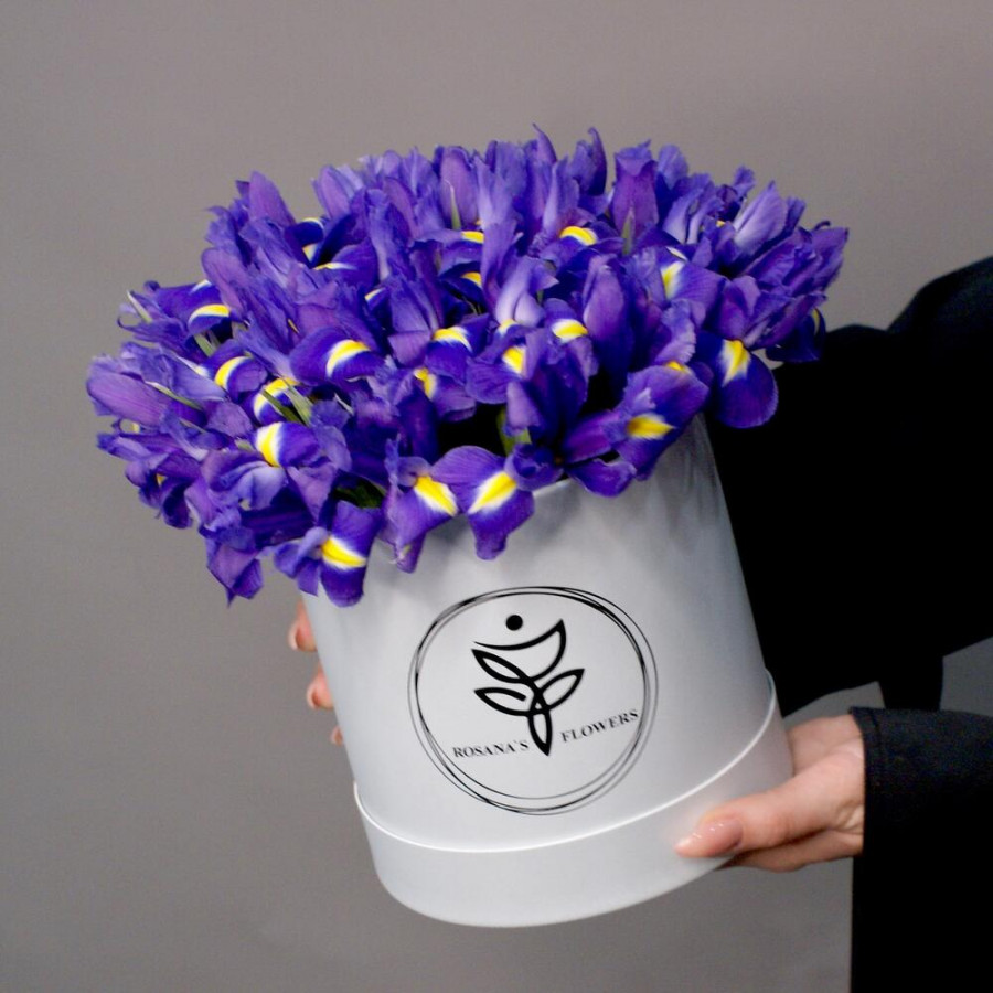 На фото 25 фиолетовых ирисов в коробке. В составе: ирис 25 шт, оазис флористический 1 шт, корзина (s) 1 шт, атласная лента 1 шт, . Все цветы свежие и ароматные, букет красиво оформлен и отлично подходит для подарка. Доступна доставка цветов или самовывоз.