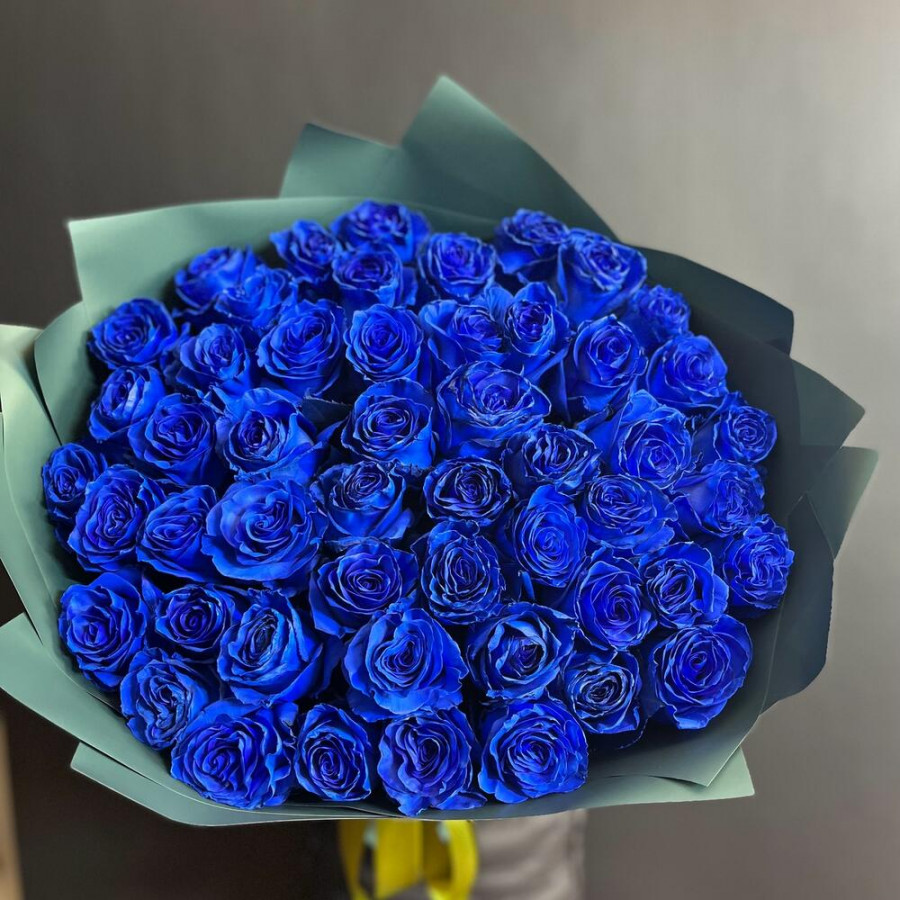 На фото 49 синих роз в дизайнерской упаковке. В составе: роза (синяя) 49 шт, дизайнерская упаковка 2 шт, атласная лента 1 шт, . Все цветы свежие и ароматные, букет красиво оформлен и отлично подходит для подарка. Доступна доставка цветов или самовывоз.