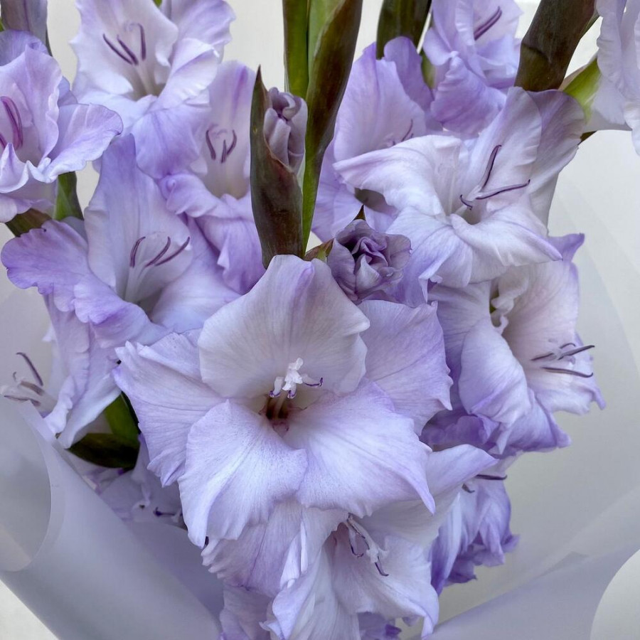 На фото букет из 5 сиреневых гладиолусов. В составе: гладиолус 5 шт, дизайнерская упаковка 1 шт, . Все цветы свежие и ароматные, букет красиво оформлен и отлично подходит для подарка. Доступна доставка цветов или самовывоз.