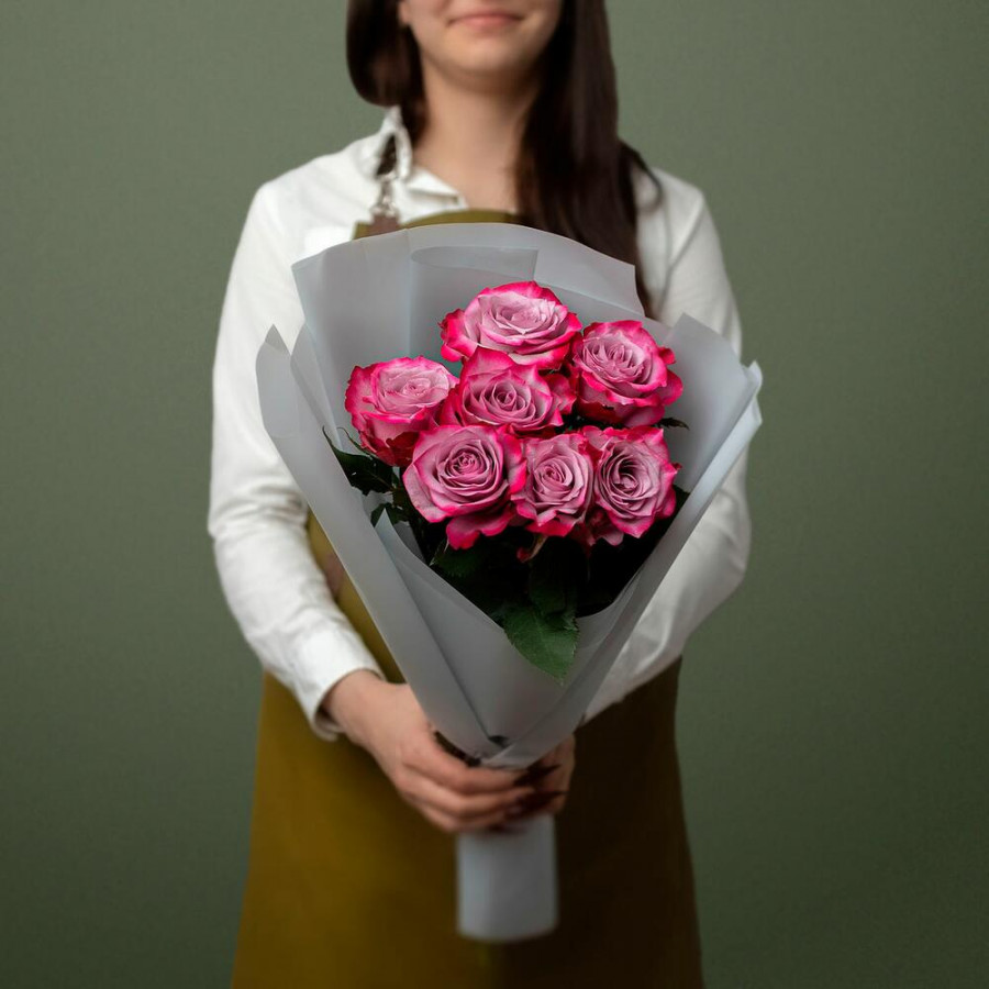 На фото букет из 7 фиолетовых роз. В составе: роза 7 шт, дизайнерская упаковка 1 шт, атласная лента 1 шт, . Все цветы свежие и ароматные, букет красиво оформлен и отлично подходит для подарка. Доступна доставка цветов или самовывоз.