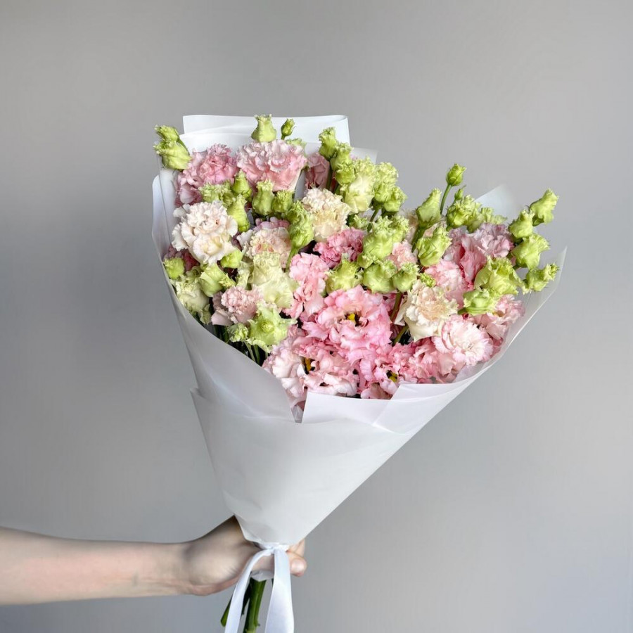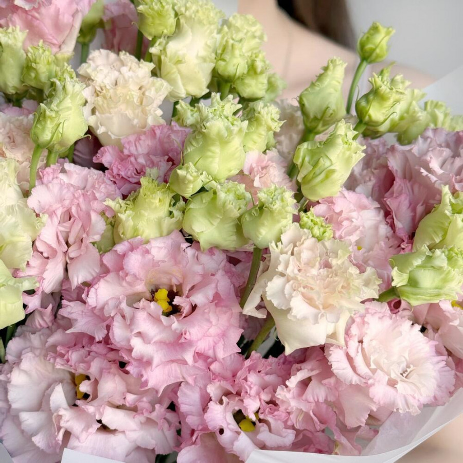 На фото букет 7 нежно-розовых эустом. В составе: эустома (лизиантус) 7 шт, дизайнерская упаковка 1 шт, атласная лента 1 шт, . Все цветы свежие и ароматные, букет красиво оформлен и отлично подходит для подарка. Доступна доставка цветов или самовывоз.