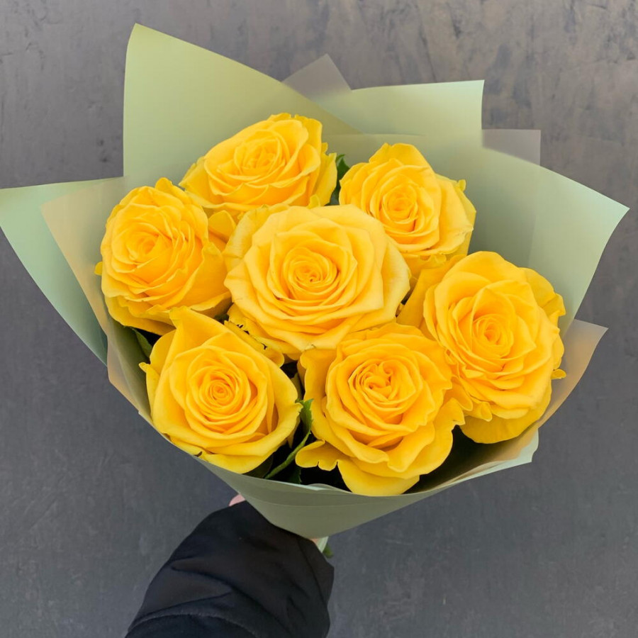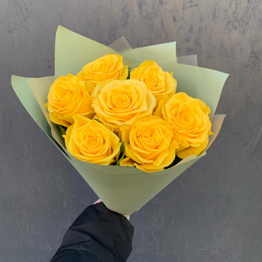 На фото букет из 7 желтых роз. В составе: роза 7 шт, дизайнерская упаковка 1 шт, атласная лента 1 шт, . Все цветы свежие и ароматные, букет красиво оформлен и отлично подходит для подарка. Доступна доставка цветов или самовывоз.