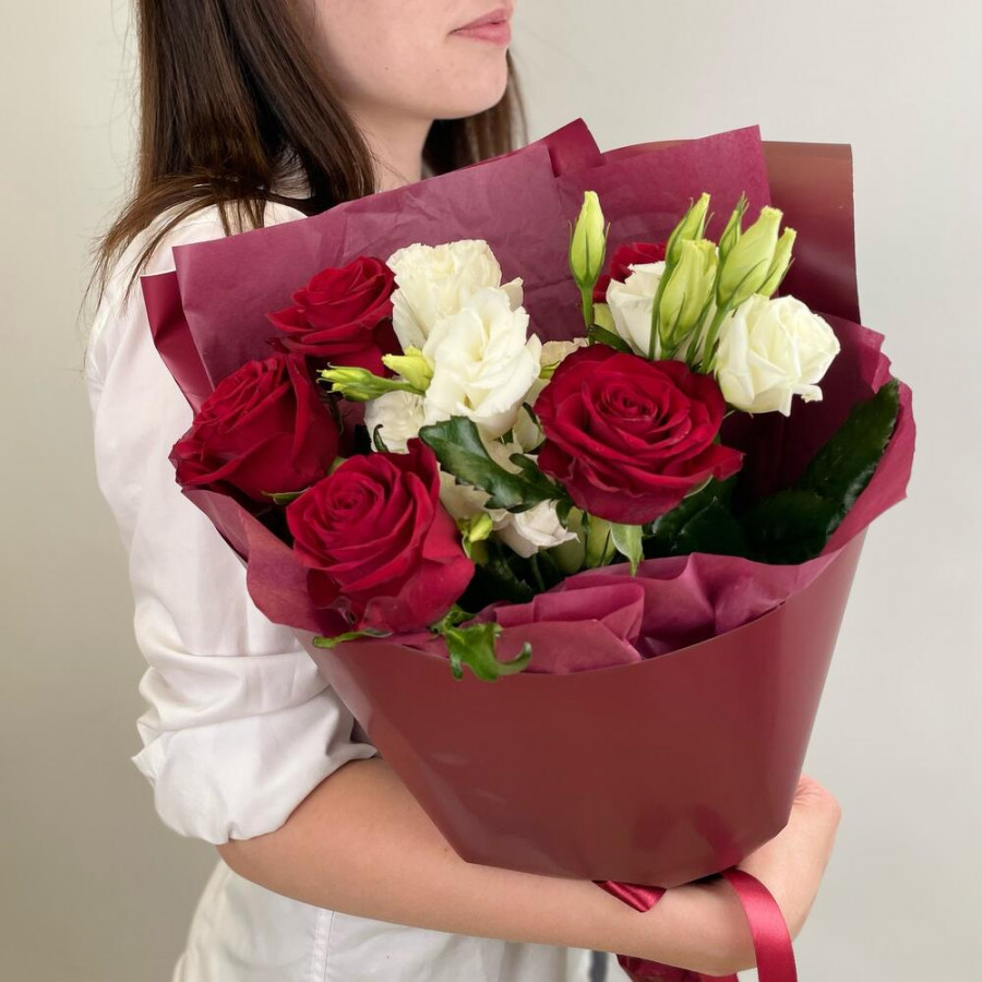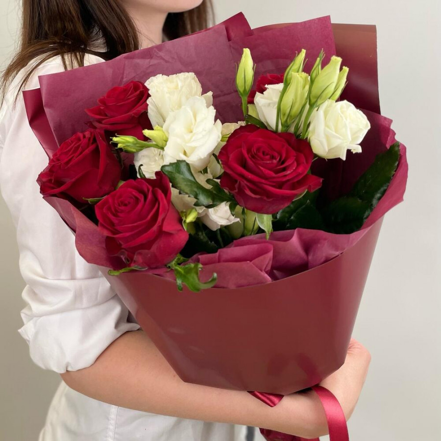 На фото букет «гранатовый сад». В составе: роза 5 шт, эустома (лизиантус) 3 шт, дизайнерская упаковка 2 шт, атласная лента 1 шт, . Все цветы свежие и ароматные, букет красиво оформлен и отлично подходит для подарка. Доступна доставка цветов или самовывоз.