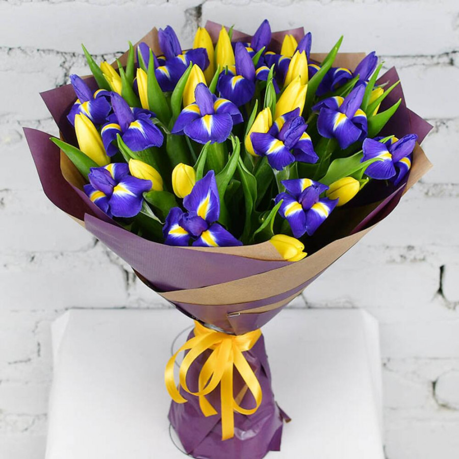 На фото букет из синих ирисов и желтых тюльпанов. В составе: ирис 15 шт, тюльпан 16 шт, крафт-бумага 1 шт, атласная лента 1 шт, . Все цветы свежие и ароматные, букет красиво оформлен и отлично подходит для подарка. Доступна доставка цветов или самовывоз.
