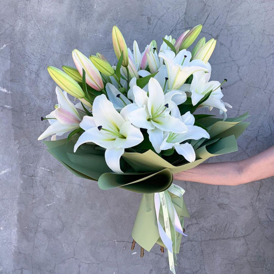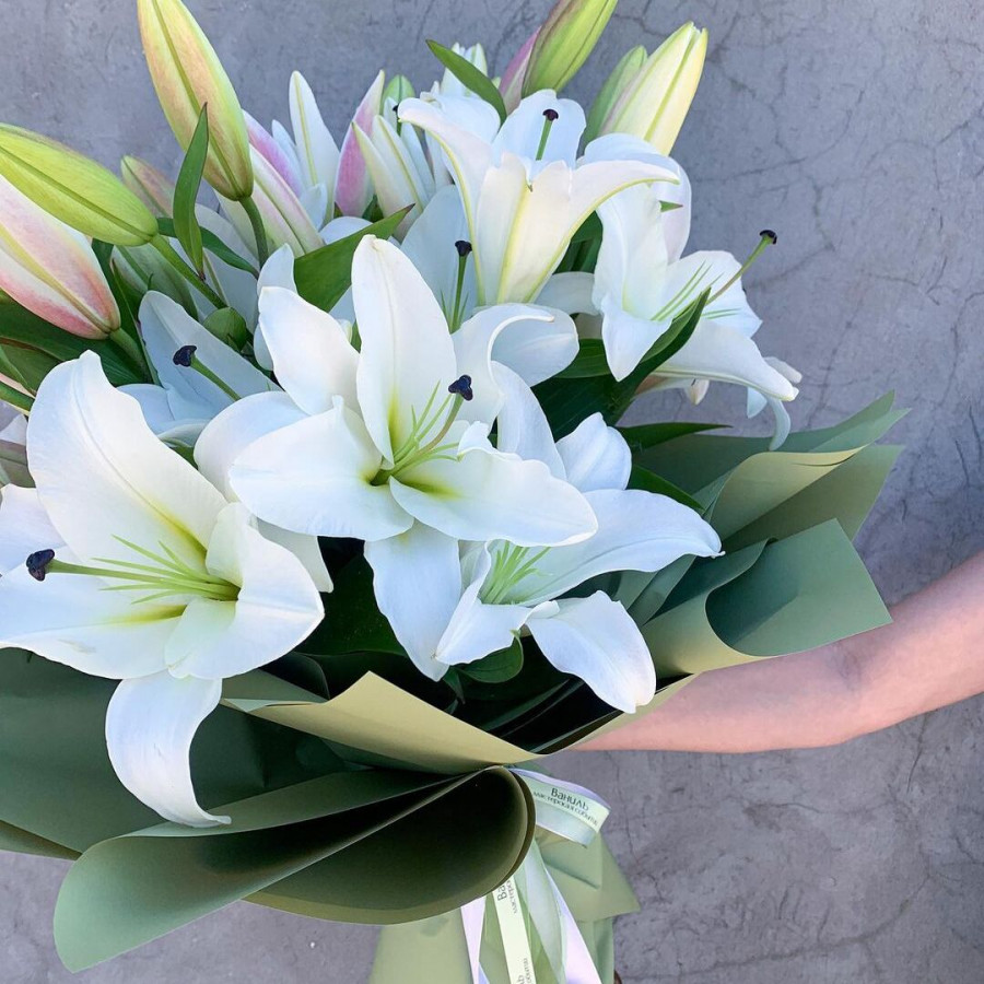 На фото букет из 5 лилий. В составе: лилия 5 шт, крафт-бумага 1 шт, атласная лента 1 шт, . Все цветы свежие и ароматные, букет красиво оформлен и отлично подходит для подарка. Доступна доставка цветов или самовывоз.
