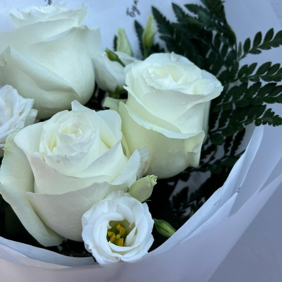 На фото букет из белых роз и эустомы. В составе: роза 3 шт, эустома (лизиантус) 1 шт, папоротник 1 шт, дизайнерская упаковка 1 шт, атласная лента 1 шт, . Все цветы свежие и ароматные, букет красиво оформлен и отлично подходит для подарка. Доступна доставка цветов или самовывоз.