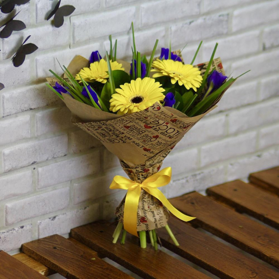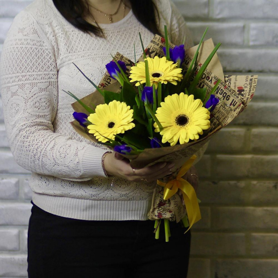 Букет из желтых гербер с синими ирисами