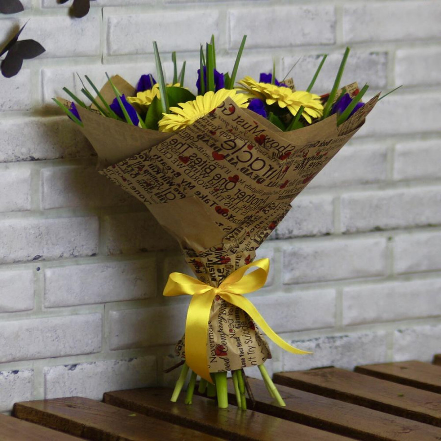 На фото букет из желтых гербер с синими ирисами. В составе: ирис 8 шт, гербера 3 шт, салал 1 шт, крафт-бумага 1 шт, атласная лента 1 шт, . Все цветы свежие и ароматные, букет красиво оформлен и отлично подходит для подарка. Доступна доставка цветов или самовывоз.