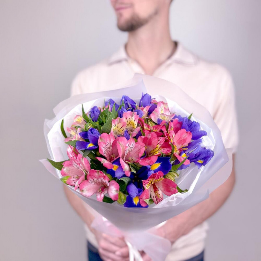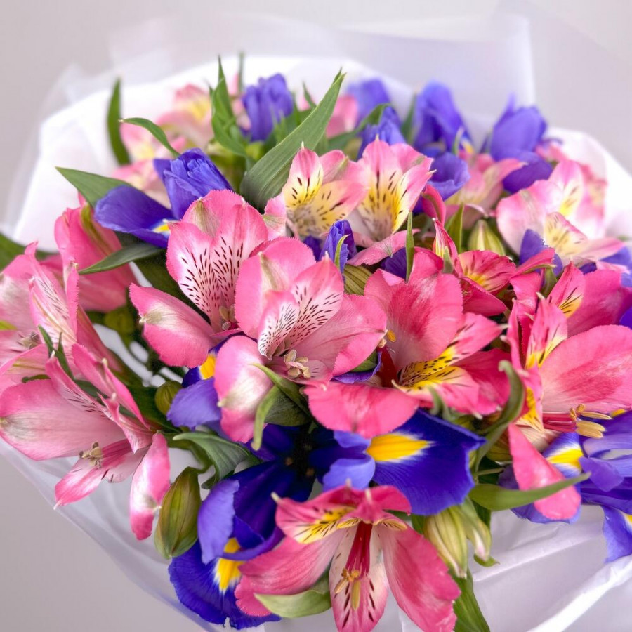 Букет из синих ирисов из розовых альстромерий в Соликамске