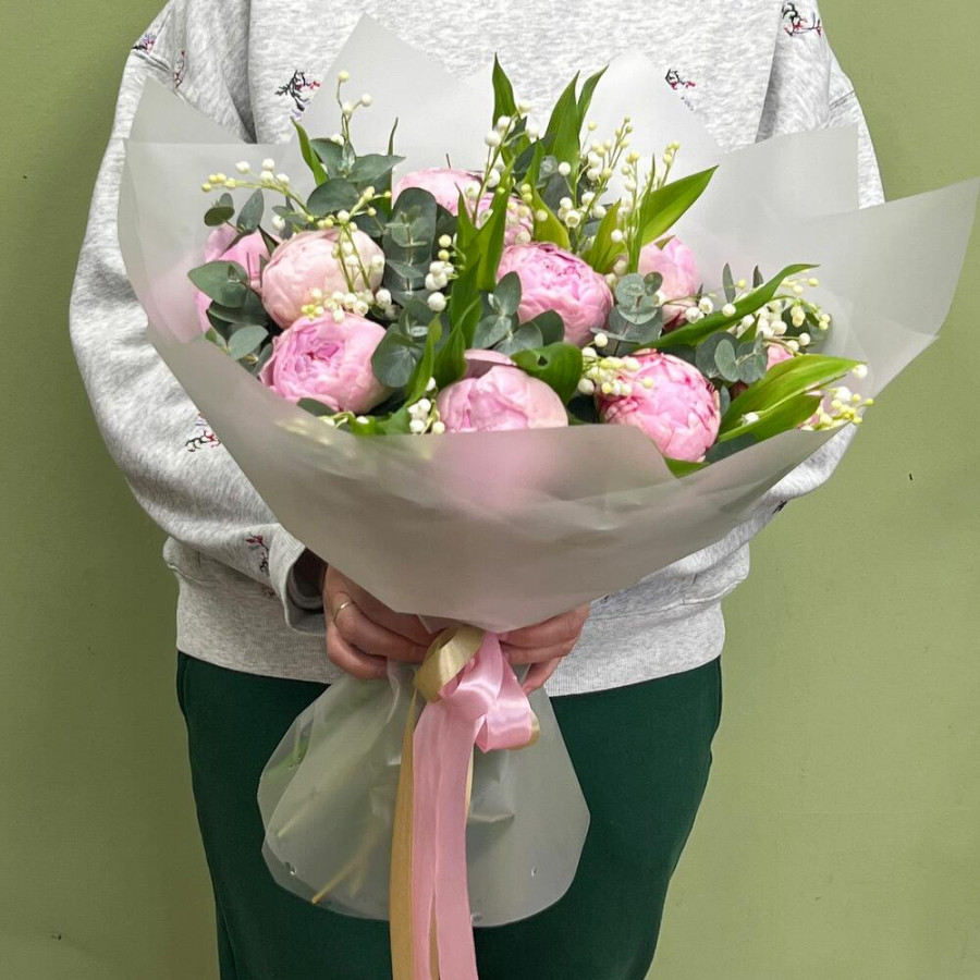 На фото букет ландышей и пионов. В составе: ландыш 25 шт, пион 11 шт, эвкалипт 5 шт, дизайнерская упаковка 1 шт, атласная лента 1 шт, . Все цветы свежие и ароматные, букет красиво оформлен и отлично подходит для подарка. Доступна доставка цветов или самовывоз.