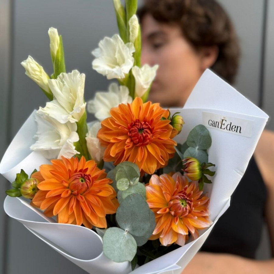 На фото букет с георгинами и гладиолусами. В составе: георгина 3 шт, гладиолус 2 шт, эвкалипт 2 шт, дизайнерская упаковка 1 шт, атласная лента 1 шт, . Все цветы свежие и ароматные, букет красиво оформлен и отлично подходит для подарка. Доступна доставка цветов или самовывоз.