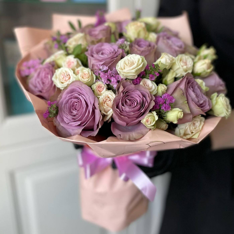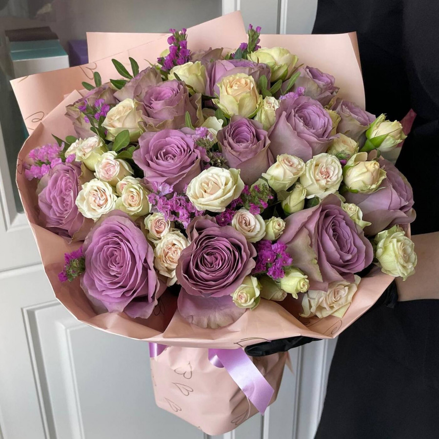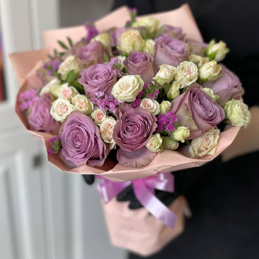 На фото монобукет из сиреневой кустовой розы. В составе: кустовая роза 11 шт, крафт-бумага 1 шт, атласная лента 1 шт, . Все цветы свежие и ароматные, букет красиво оформлен и отлично подходит для подарка. Доступна доставка цветов или самовывоз.