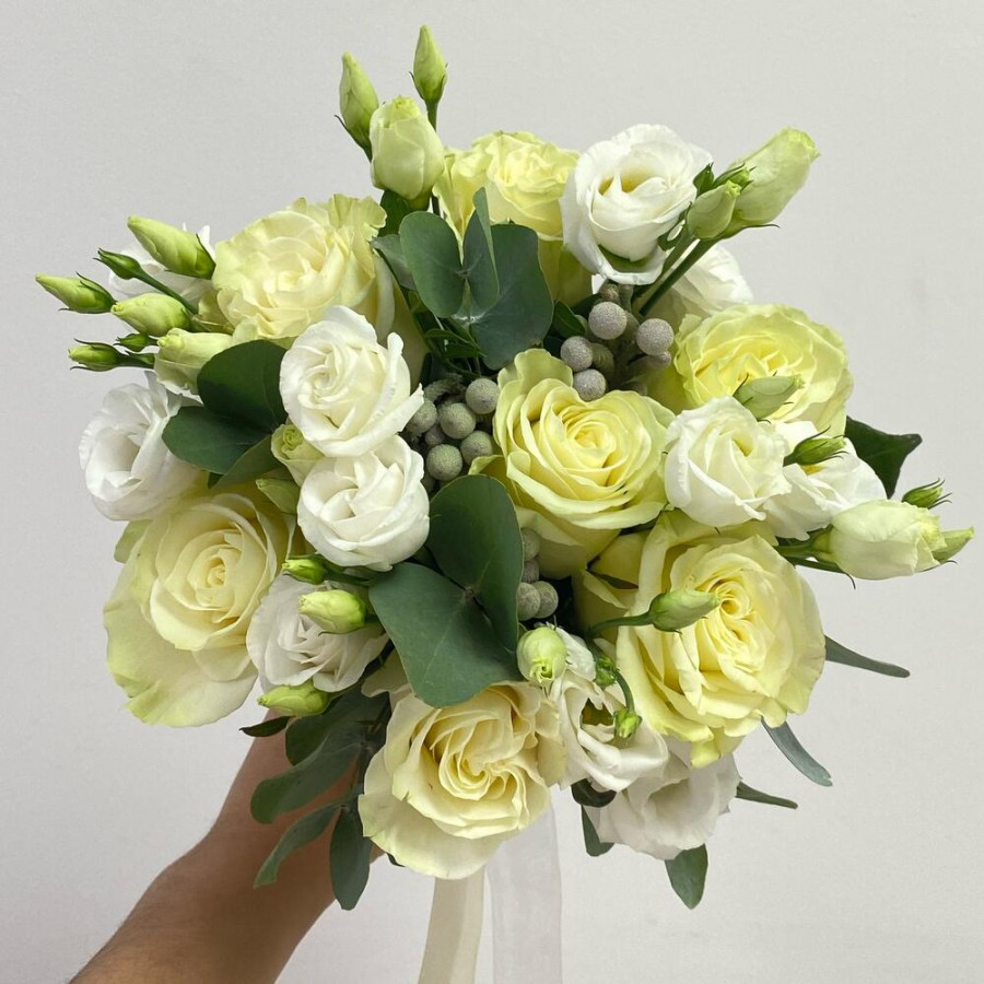 На фото свадебный букет из белых эустом и роз. В составе: эустома (лизиантус) 3 шт, роза 7 шт, бруния 2 шт, эвкалипт 1 шт, атласная лента 2 шт, . Все цветы свежие и ароматные, букет красиво оформлен и отлично подходит для подарка. Доступна доставка цветов или самовывоз.